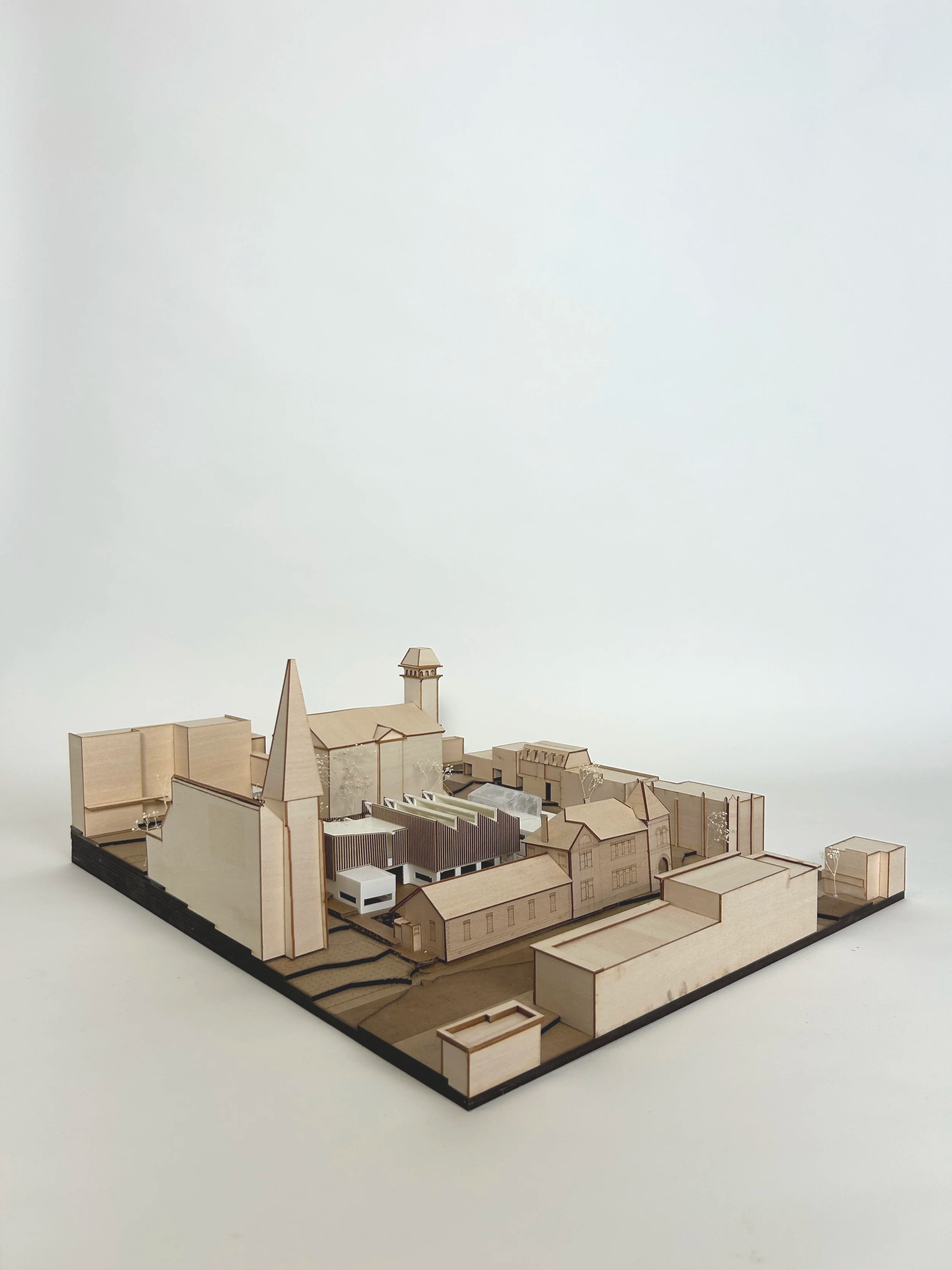 it all started with water honours and celebrates an element, though often taken for granted, indispensable for both the market's and the visitors' existence and mutual flourishing-water. Upon visiting the site, water stood out as the supernatural force stitching the context together. From the river to the surrounding buildings, the market, church, and city archives all possess a deep relationship to water. The 1974 Cambridge flood is a testament to water's prominence on site. The site is primarily organized around a long rain garden, located at the lowest elevation point of the site and separating the old market from the new addition. An outdoor space runs parallel, evoking the market's historical presence along the east banks of the river. The project takes on a holistic approach to highlighting water education and access. Water is used in multiple ways, from providing sanitation, leisure and play activities in the public realm to more pragmatic building and site functions. As a comprehensive studio project, sustainability and detailing were at the forefront of the design. Our approach was to use innovative materials that not only enhance the concept, but also the overall experience of the building and surrounding landscape.